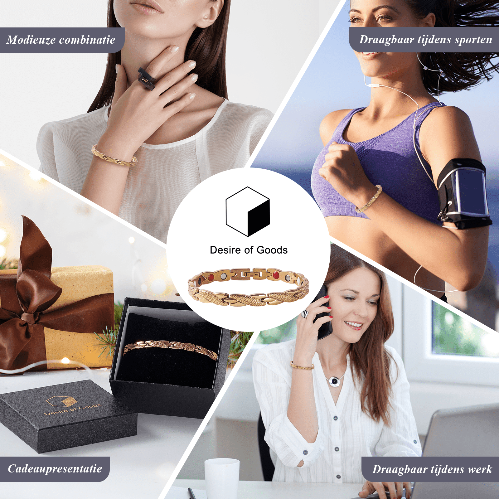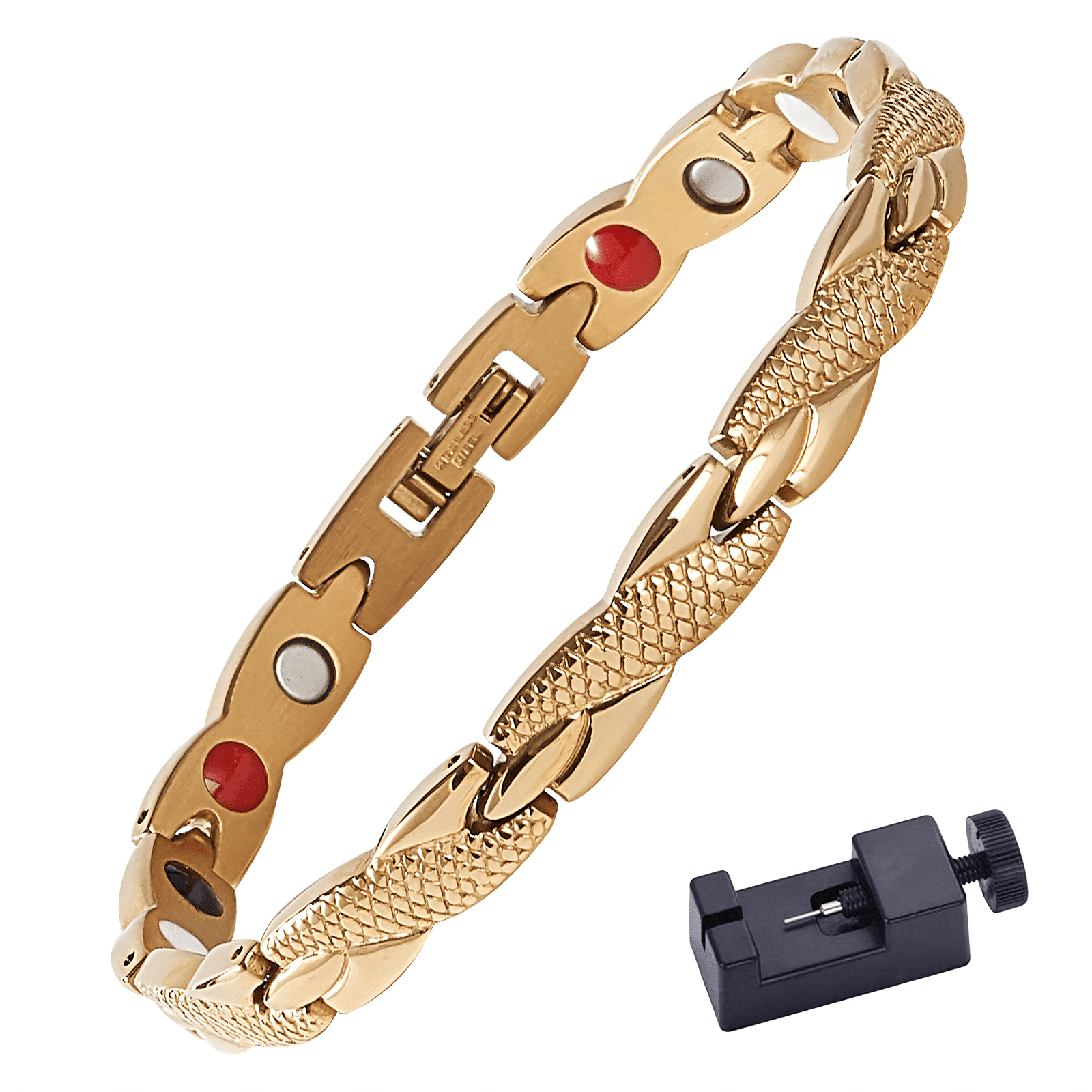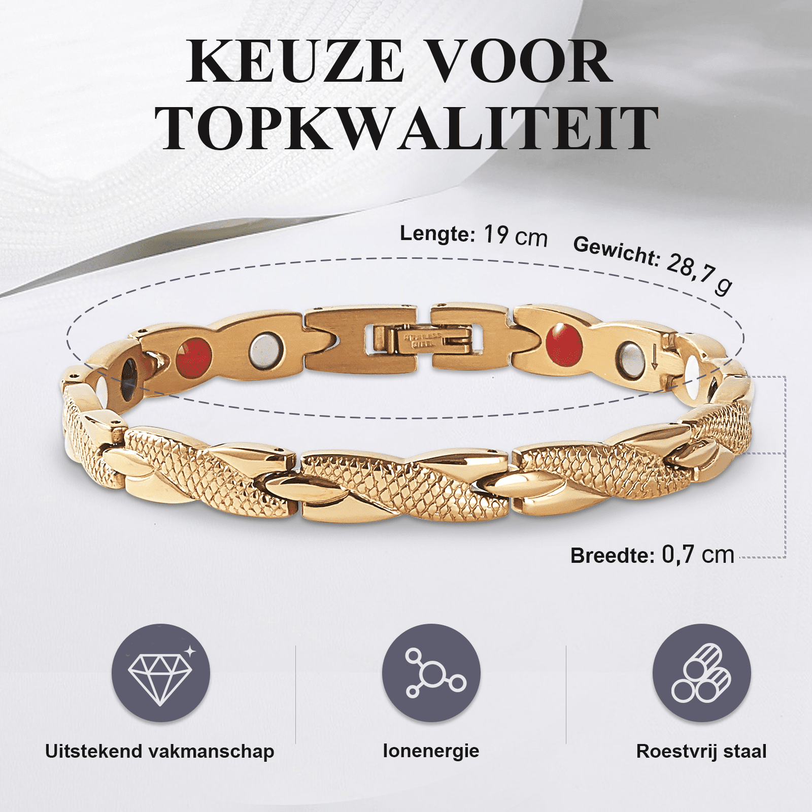 De armband is gemaakt van hoogwaardig edelstaal. In de binnenkant van de armband zitten diverse magneten bevestigd voor de werking van het product. De armband kan helpen met afvallen omdat het een aantal symptomen in uw lichaam controleert. Dit geldt alleen in combinatie met een gezonde levensstijl.