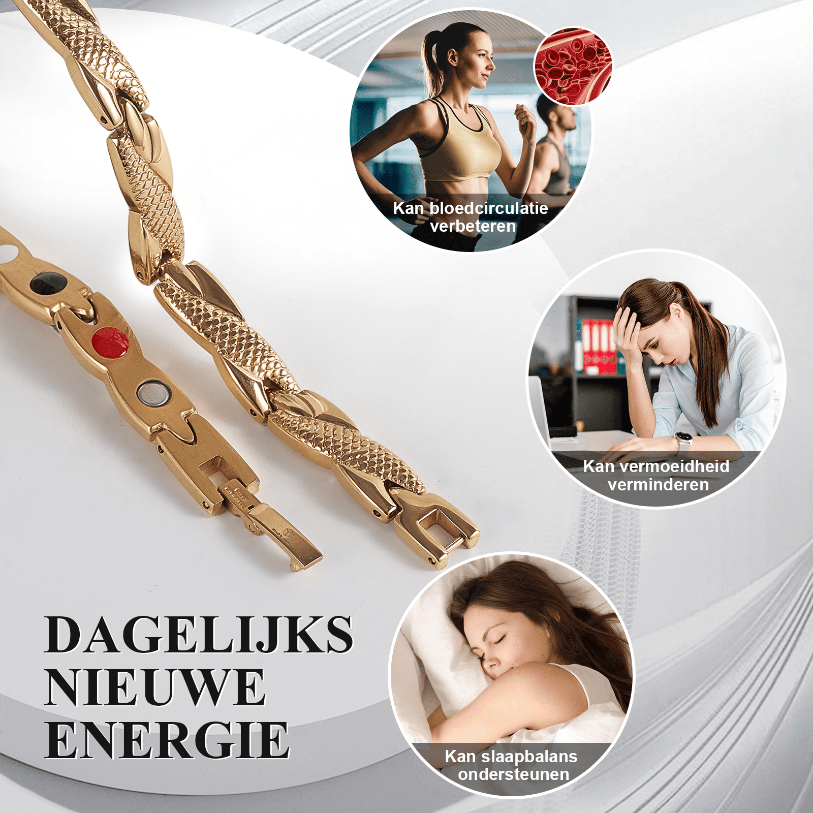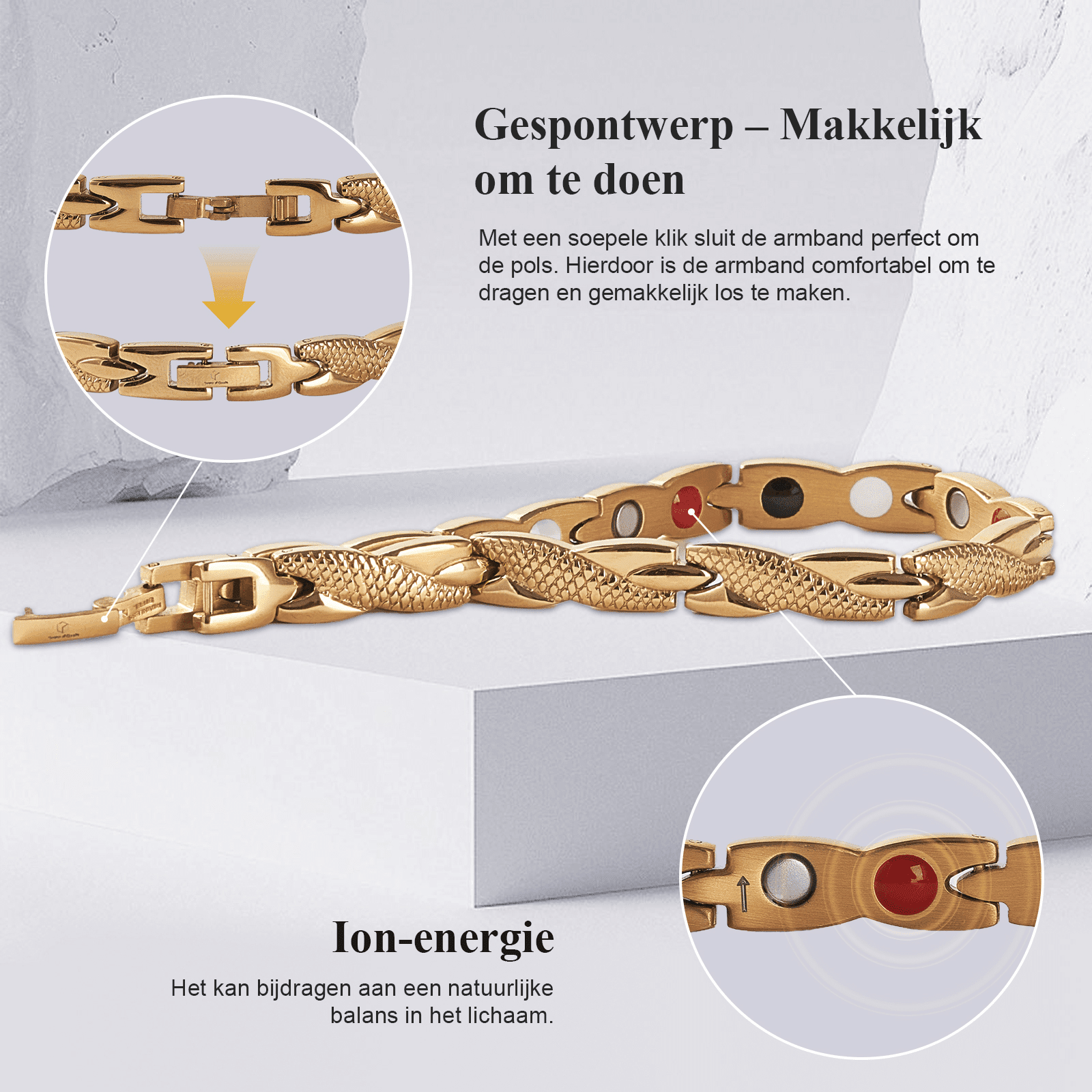 De magnetische armband zorgt ervoor dat negatieve ionen naar uw lichaam worden tegengehouden. Dagelijks krijgen we duizenden negatieve ionen binnen vanuit apparaten zoals mobiele telefoons, computers, tablets etc.