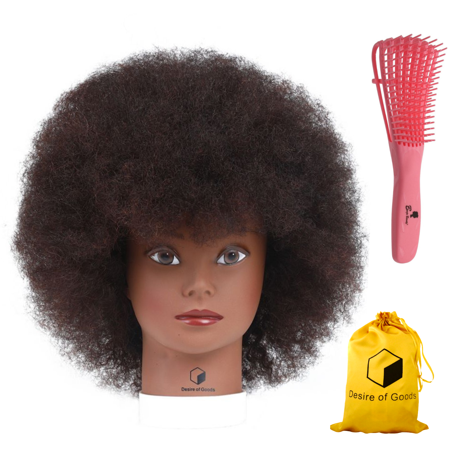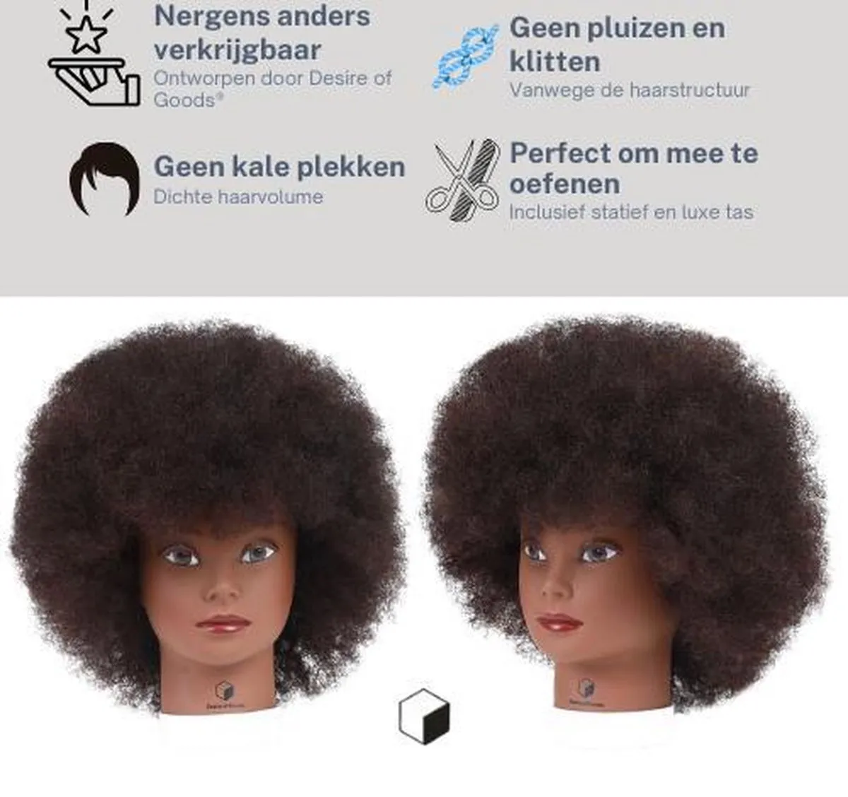 Met deze alles in 1 Afro oefenhoofd kappershoofd kom je een eind op weg. Het oefenhoofd is gemaakt van menselijk haar waardoor je deze pop jarenlang kan gebruiken.