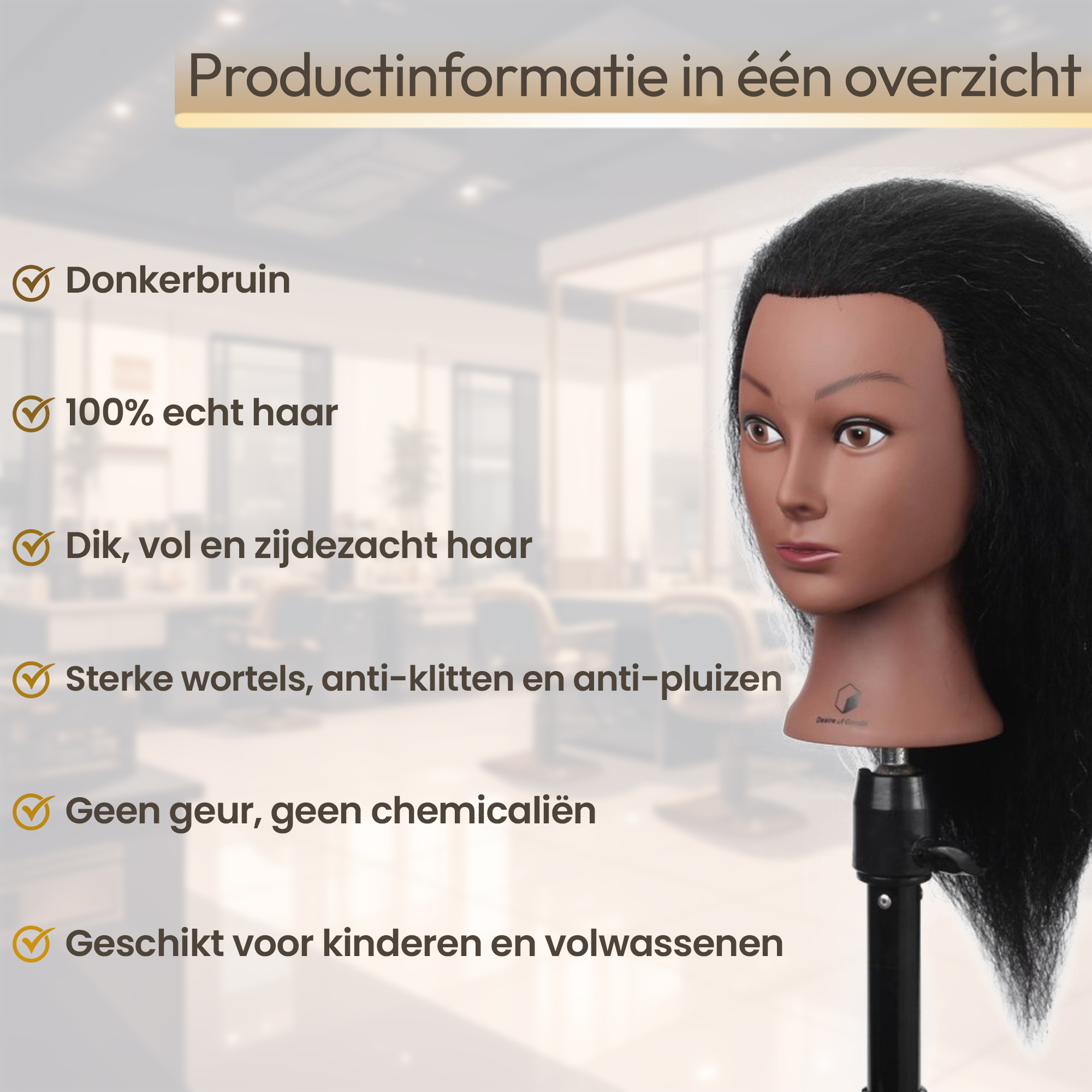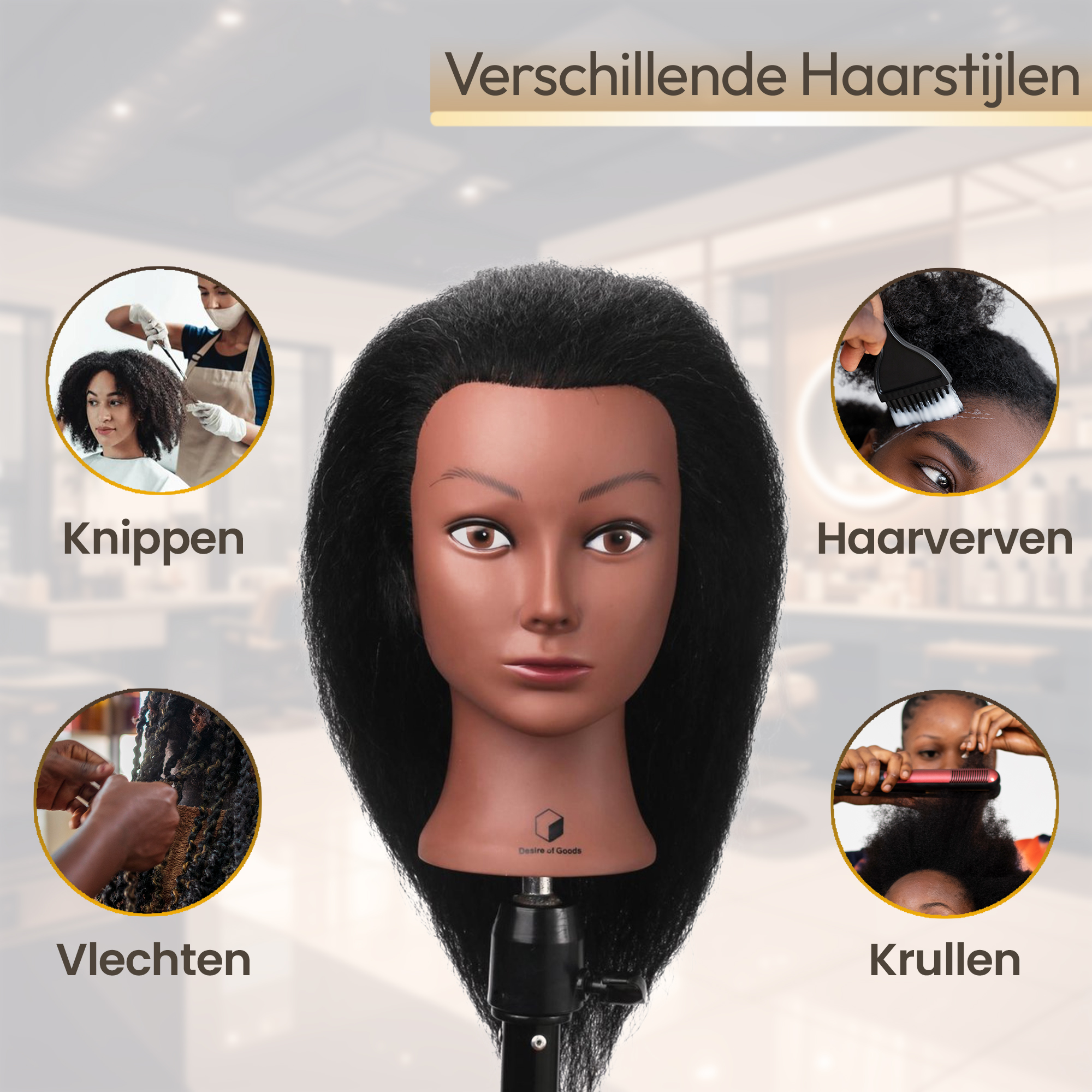 Desire of Goods Afro oefenhoofd kappershoofd – Donkerbruin 100% Echt haar – Met tafelklem en anti klit haarborstel